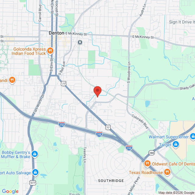 On Teasley Lane, north of I-35, north of the round-about by D-Bat Denton, just north of Shady Oaks Drive. Park in parking lot.